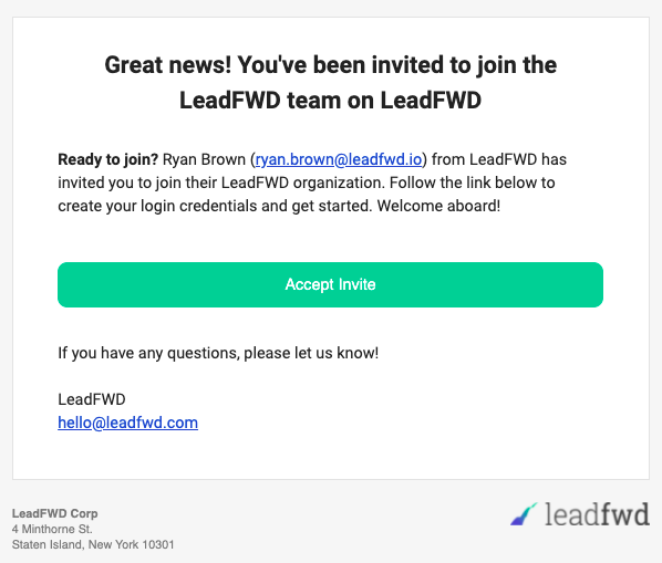 The invite will arrive in the inbox of the invited user. The invite will come from the Admin of the organizational LeadFWD account.